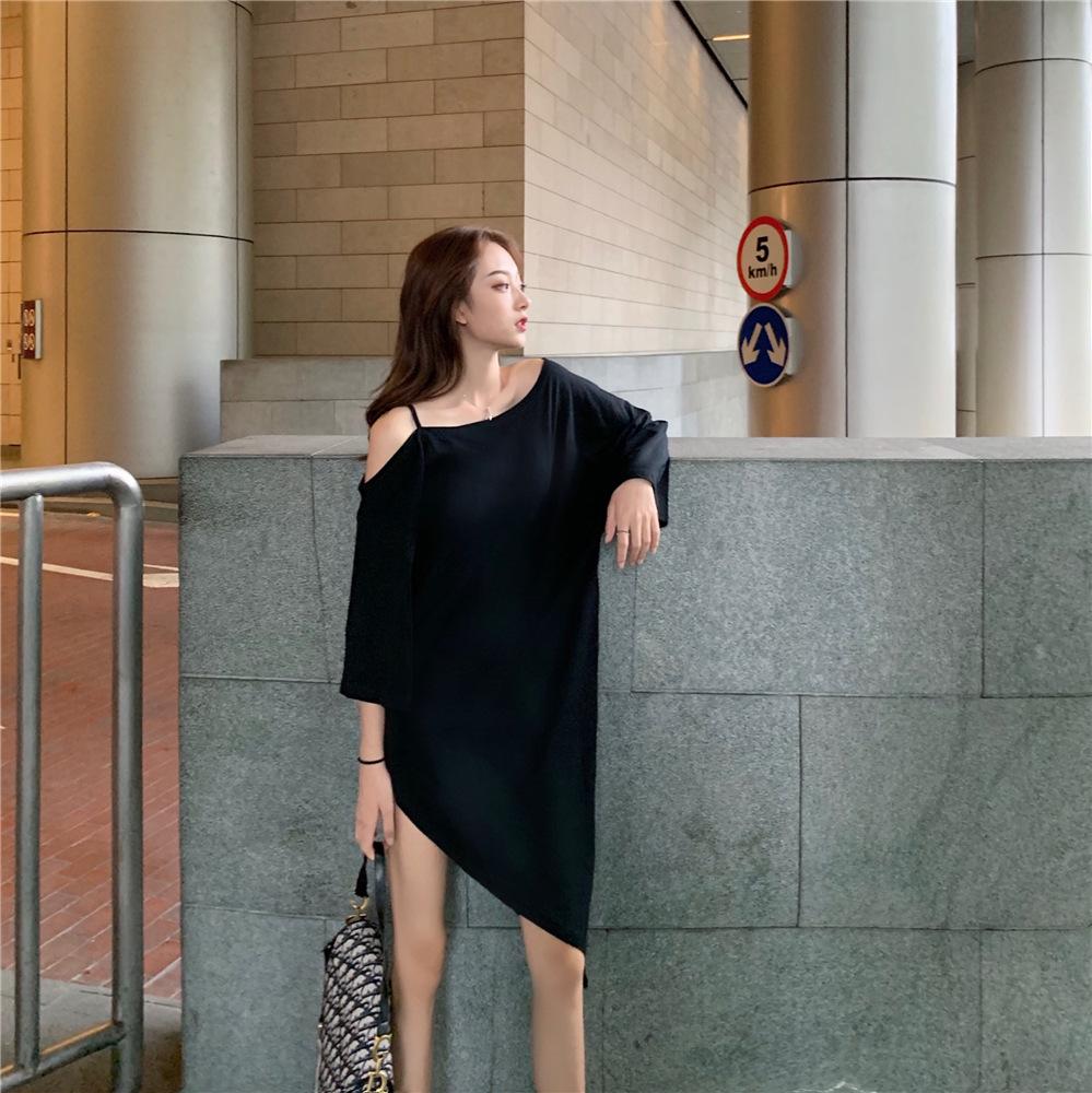 Платье средней длины с наклонными плечами, модное летнее свободное корейское платье-комбинация большого размера, модное женское платье XXXL чёрный