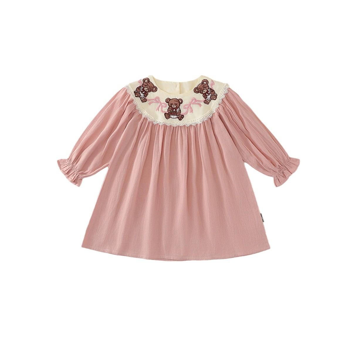 Платье с длинными рукавами и вышитым медведем для девочек 2024 года, осеннее новое детское платье принцессы с розовыми рукавами-фонариками в милом стиле 110cm розовый