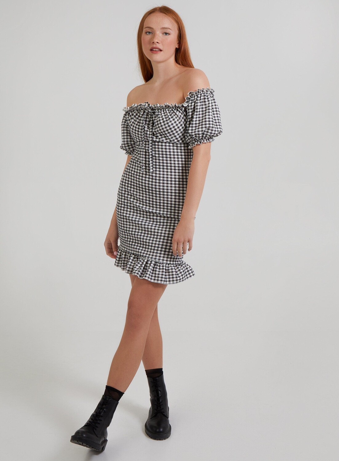 Это клетчатое платье идеально подходит как для дня, так и для вечера. Модель из черного материала с оборками на плечах и подоле. Дополните его туфлями на каблуке и простыми аксессуарами, чтобы завершить образ.