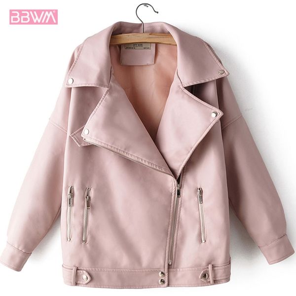 pink pu long sleeve lapel loose zip long sleeve women's jacket 2019 autumn new elegant casual motorcycle female coat black top, Black;brown
