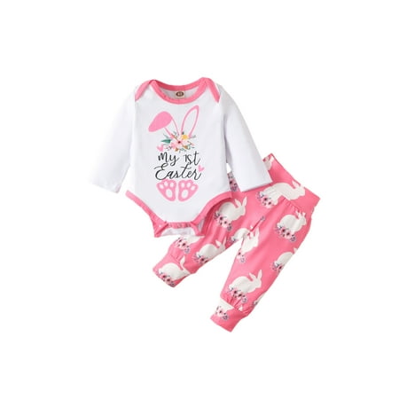 LSFYSZD 2 Pieces Baby Suit Set Letter Flower Rabbit Print Round Neck Long Sleeve Romper+ Long Pants 0-24 Months