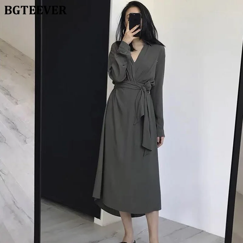 Платье BGTEEVER женское свободного кроя, повседневное винтажное ТРАПЕЦИЕВИДНОЕ с V-образным вырезом, с длинным рукавом, на шнуровке, 2019