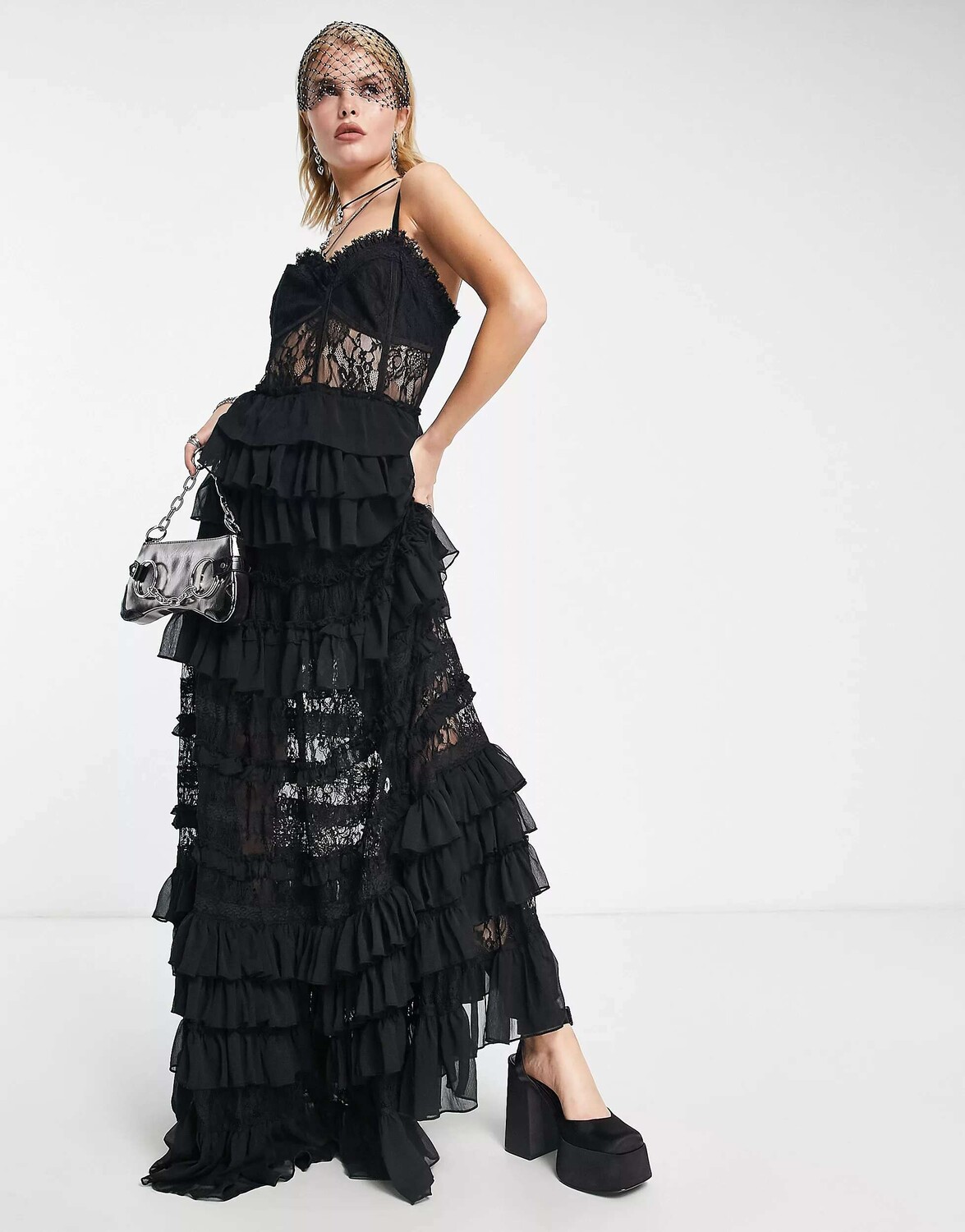 Черное корсетное платье макси с многоуровневым кружевом Reclaimed Vintage Limited Edition, Черный