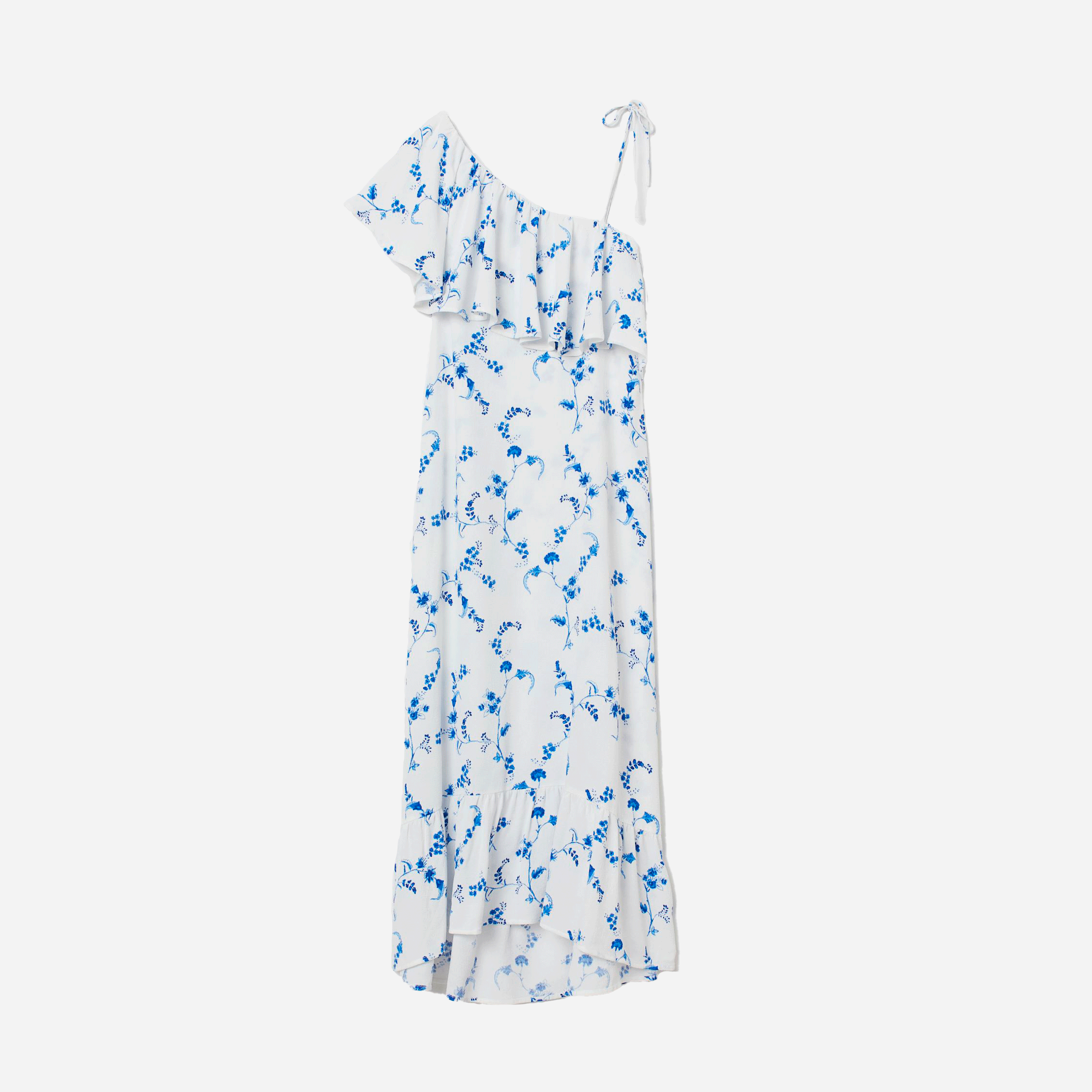Платье длиной до лодыжки из креповой ткани с набивным рисунком. Открытое плечо с узкой лямкой, которую можно завязать. Широкая оборка сверху и на одном плече. Отрезной подол с широким воланом, а также удлиненная спинка. Без подкладки. Возможно повреждение бирки.