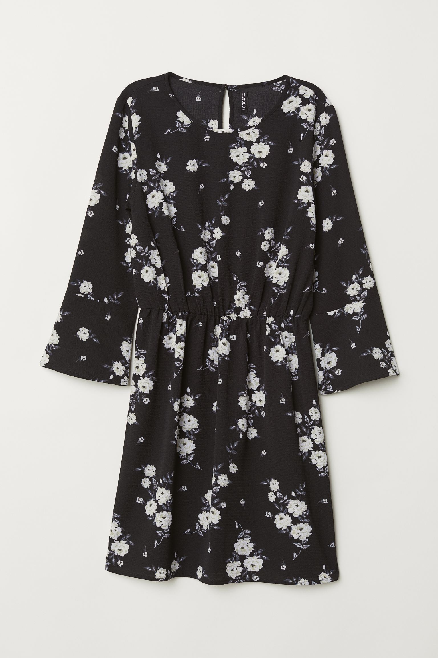 Короткое платье из креповой ткани с круглым вырезом горловины и разрезом сзади с обтянутой пуговицей. Рукава длиной три четверти с широкой оборкой снизу. Отрезная талия на резинке. Без подкладки.