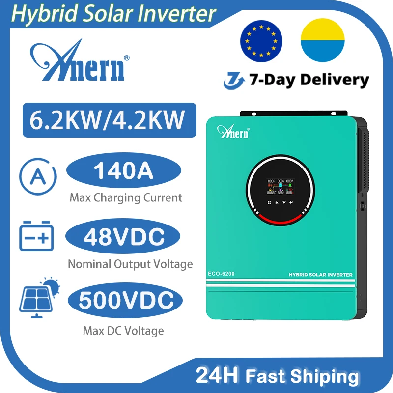 Anern Solar Hybrid Inverters 6.2KW 4.2KW 24V 48V With MPPT 140A Charger Controller Dual AC Output Pure Sine Wave for Home System