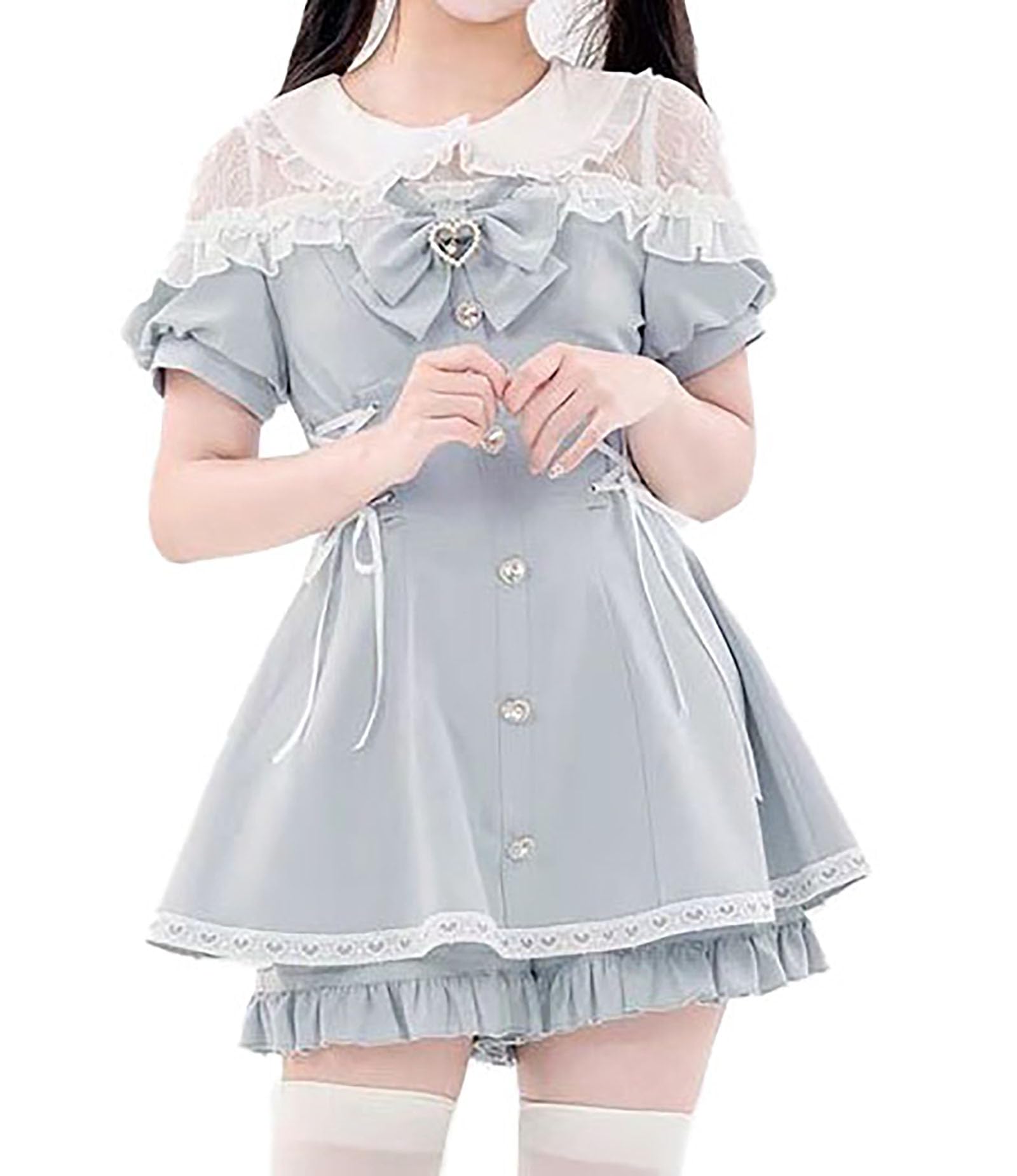 Платье Jundakara со съемной лентой, открытое и в стиле Лолита, студенческое, легкое, размер M, женское, брошь, плечо, оборки, шнуровка, стиль, синий