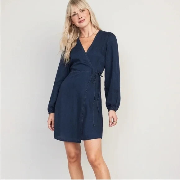 Платье Old Navy из шамбре с запахом, размер M, высокий, Синий