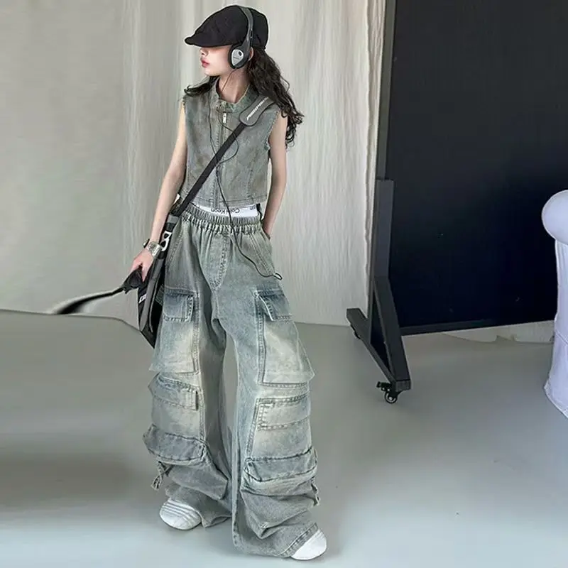 High Quality Child Jeans Suits 2 Piece Set for Girl Casual Spring Autumn Clothing Set Cargo Jeans + Denim Tops Outfit Streetwear