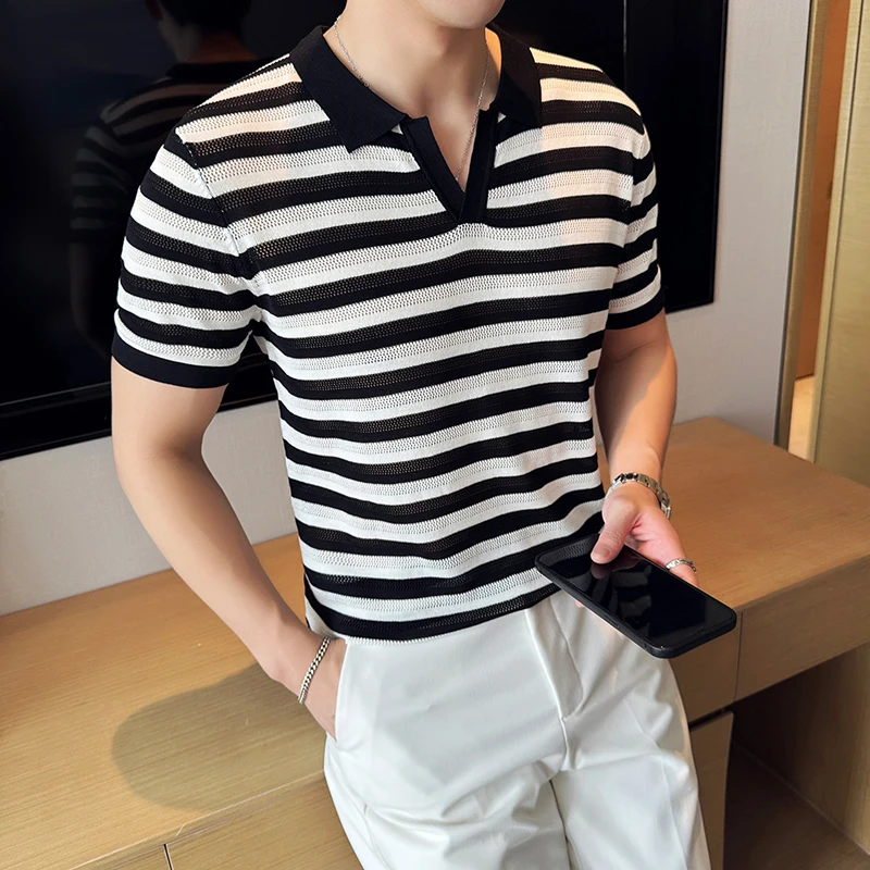 Summer Men's Polo Shirts Contrasting Colors V-neck Knitted T-shirt Slim Fit Short Sleeve Casual Business POLO T-shirts 2024