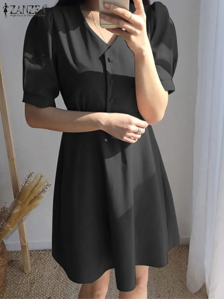 Платье ZANZEA женское ТРАПЕЦИЕВИДНОЕ Плиссированное с пышными рукавами и V-образным вырезом
