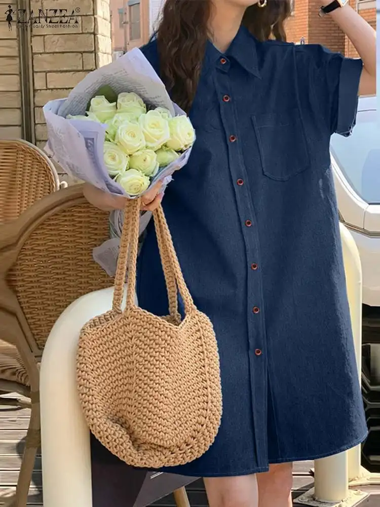 Платье ZANZEA женское джинсовое с отворотом, сарафан с коротким рукавом, Синее джинсовое платье, кафтан, на лето
