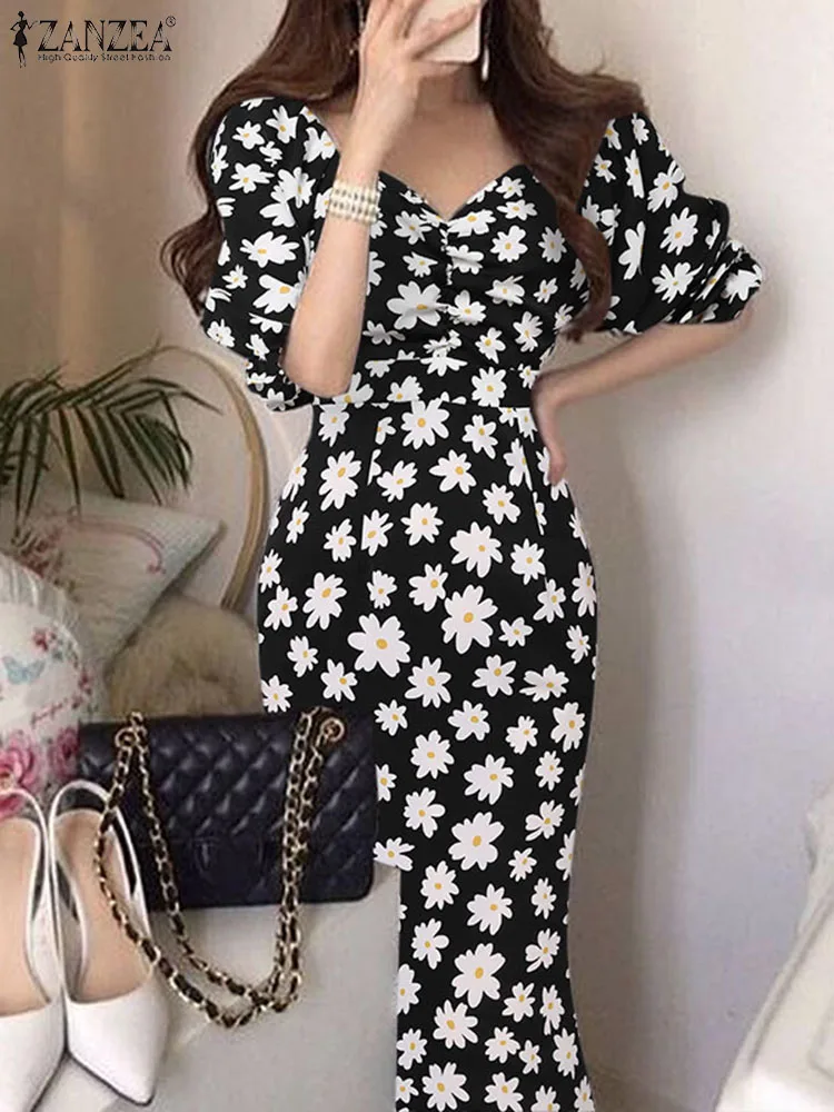 Платье ZANZEA женское средней длины с пышными рукавами, элегантное приталенное, с цветочным принтом, с V-образным вырезом, с оборками, в Корейском стиле, на лето