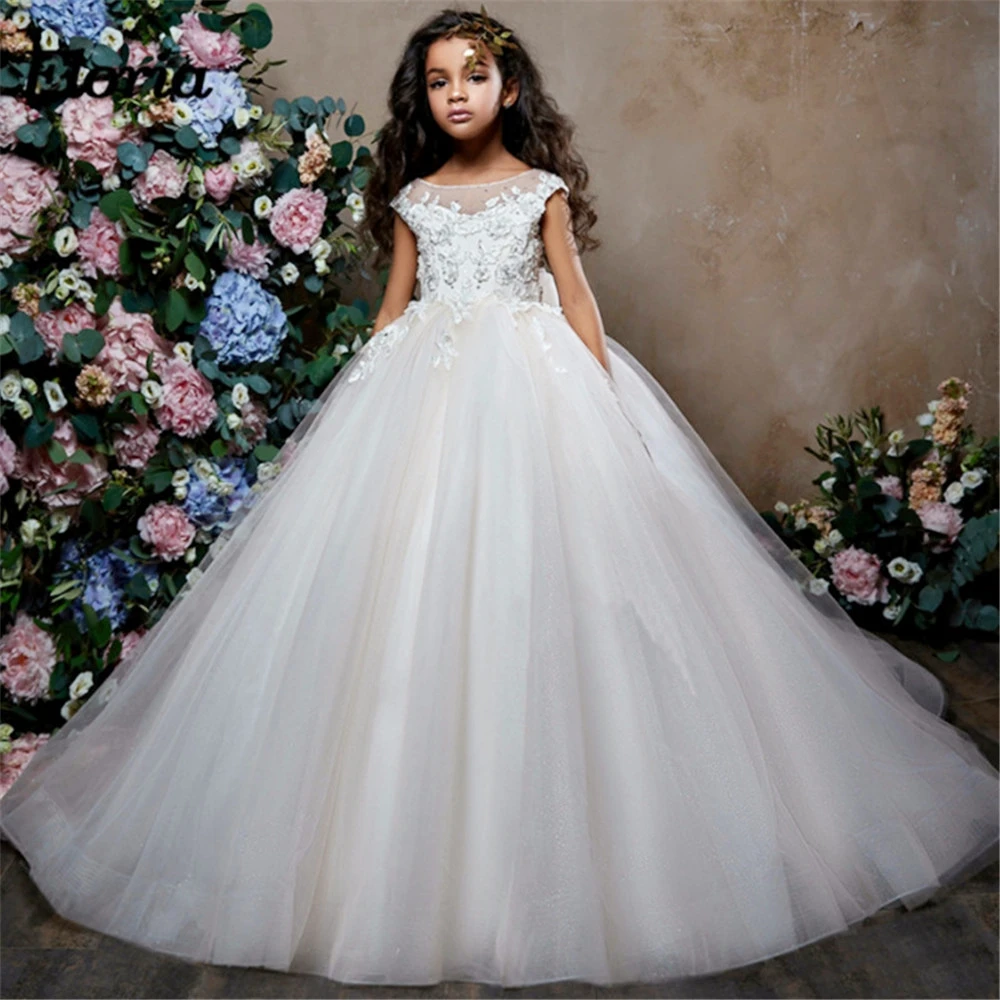 Платья для девочек с цветами, свадебные платья, детские Бальные платья с перьями для первого причастия, платья принцессы до пола