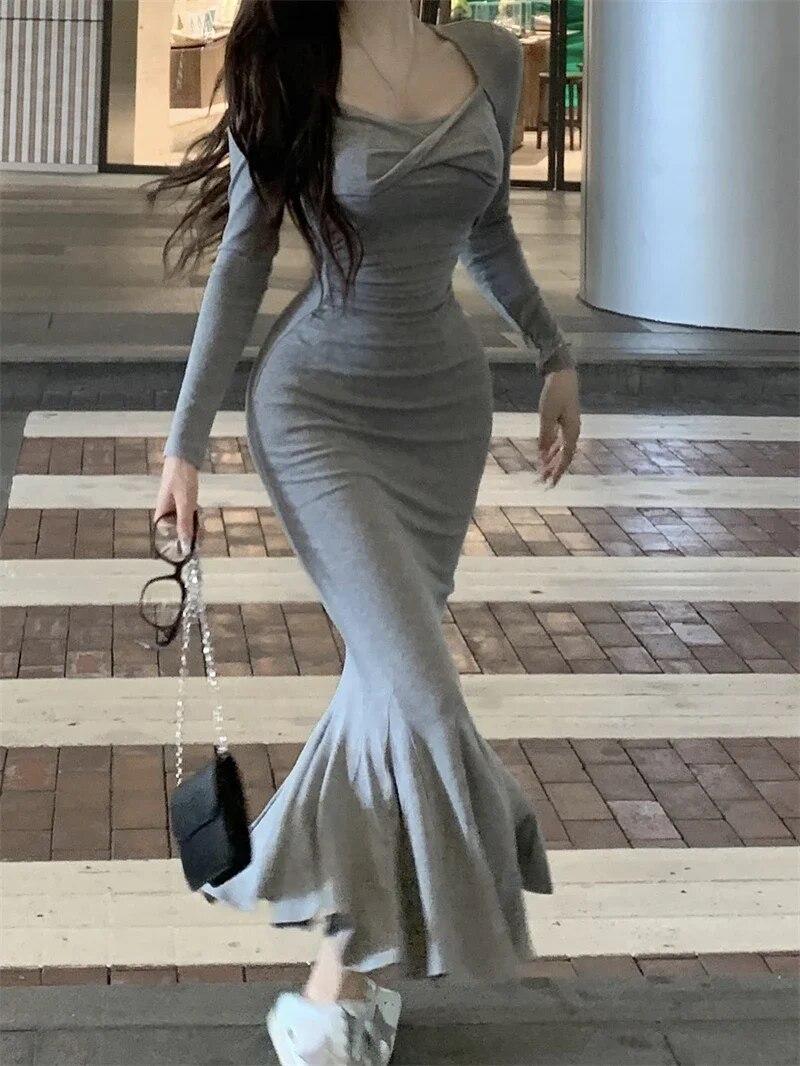 Платья миди облегающего кроя Женские Корейская мода Сексуальное Облегающее талию Однотонное платье Женская Вечерняя одежда для вечеринок 2025 Весна Элегантная мода Y2k XL серый