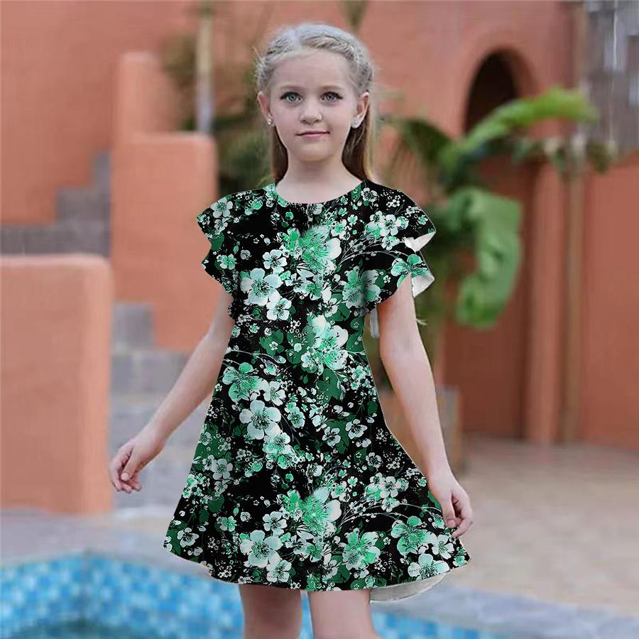 Платья с принтом для девочек, детское праздничное платье для девочек, свободная облегающая юбка с короткими рукавами для девочек старше четырех лет 110 циан