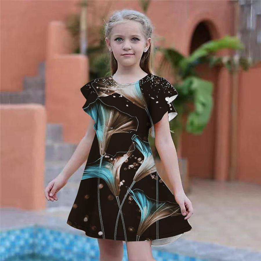 Платья с принтом лилий и градиента для девочек. Детское праздничное платье для девочек. Свободная облегающая юбка с короткими рукавами для девочек старше четырех лет.