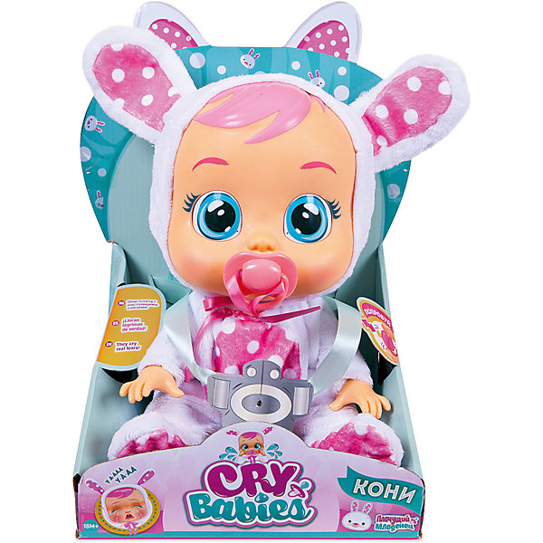 Плачущий младенец Кони с виниловым тельцем носит костюм зайчика, который представлен в виде комбинезончика с капюшоном, декорированным ушками. Ровозощекая куколка по имени Кони настоящая красотка: голубые глаза, челочка, курносый носик. Но когда Кони чем-то расстроена или грустит, по её щёчкам катятся крупные слёзки. Как же успокоить малышку? Просто предложить ей пустышку или уложить на спинку. Тогда Кони успокоится и перестанет плакать.