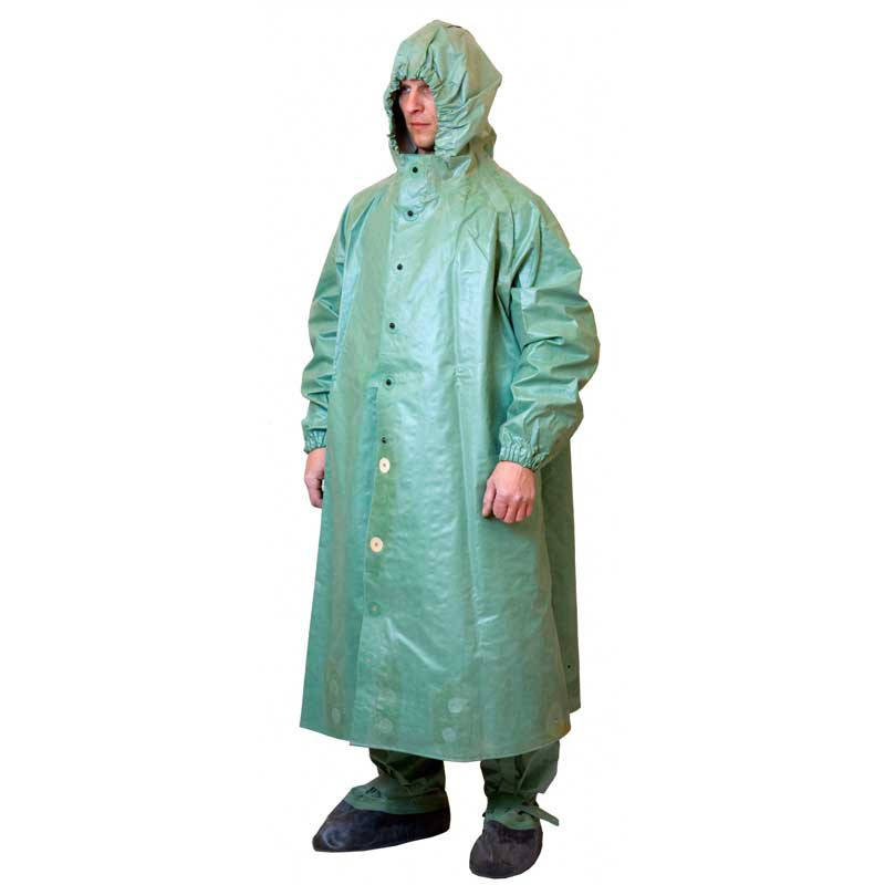 Плащ ОЗК из прорезиненной ткани с капюшоном для защититься от дождя.