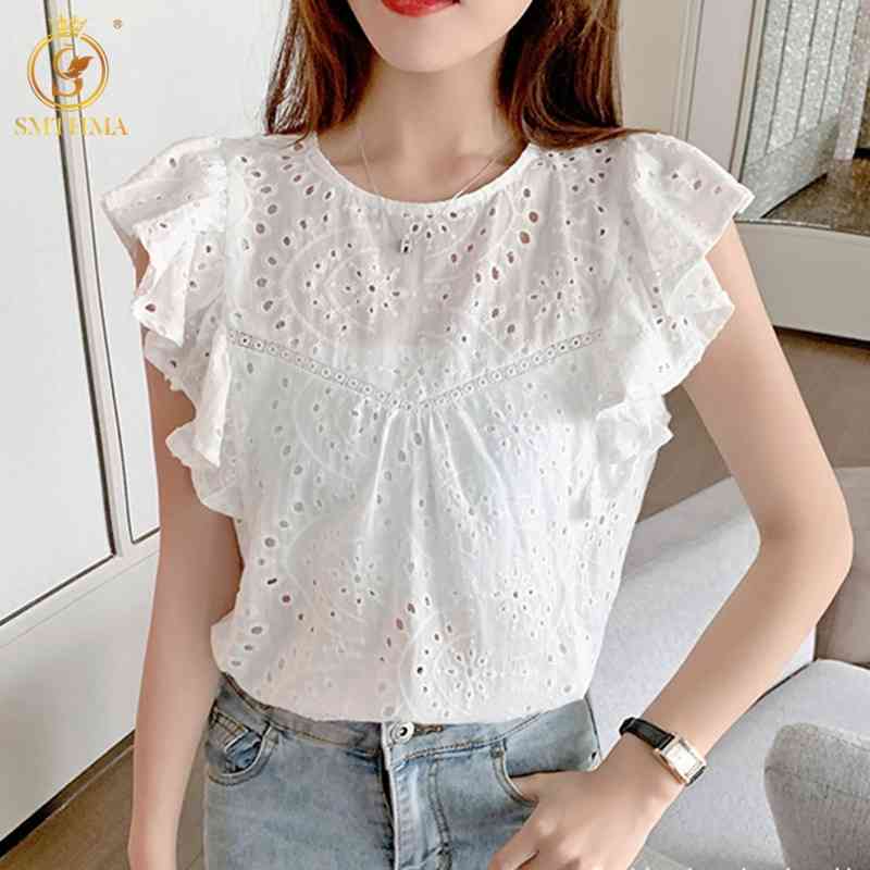 Summer Lace Hollow Out T-Shirt Women Ruffles Short Sleeve Tees Elegant Casual Solid Ladies O Neck White Tops 210520, Photo color