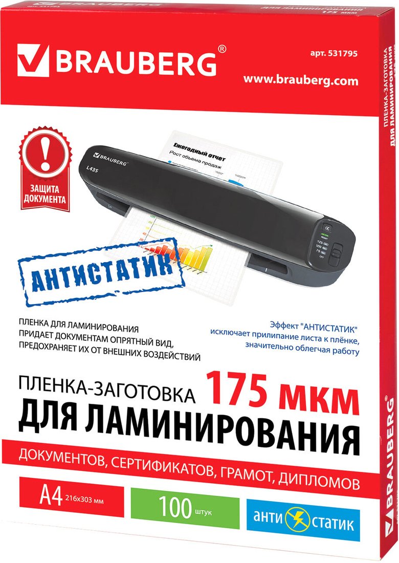 Пленка для ламинирования BRAUBERG Brauberg А4 175 мкм 100 шт 531795 (глянцевый, прозрачный)