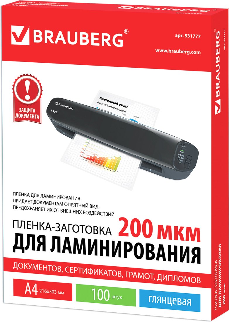 Пленка для ламинирования BRAUBERG глянцевая A4 200 мкм 100 шт 531777