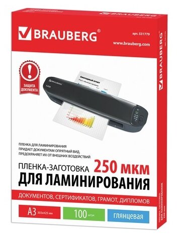 Пленка для ламинирования Brauberg 250мкм, 303x426 (A3), 100 шт., глянцевая (531779)