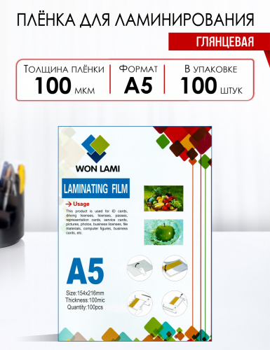 Пленка для ламинирования Won Lami 100мкм, 154x216 (A5), 100 шт., глянцевая (7680)