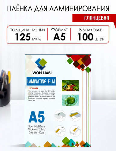 Пленка для ламинирования Won Lami 125мкм, 154x216 (A5), 100 шт., глянцевая (7687)