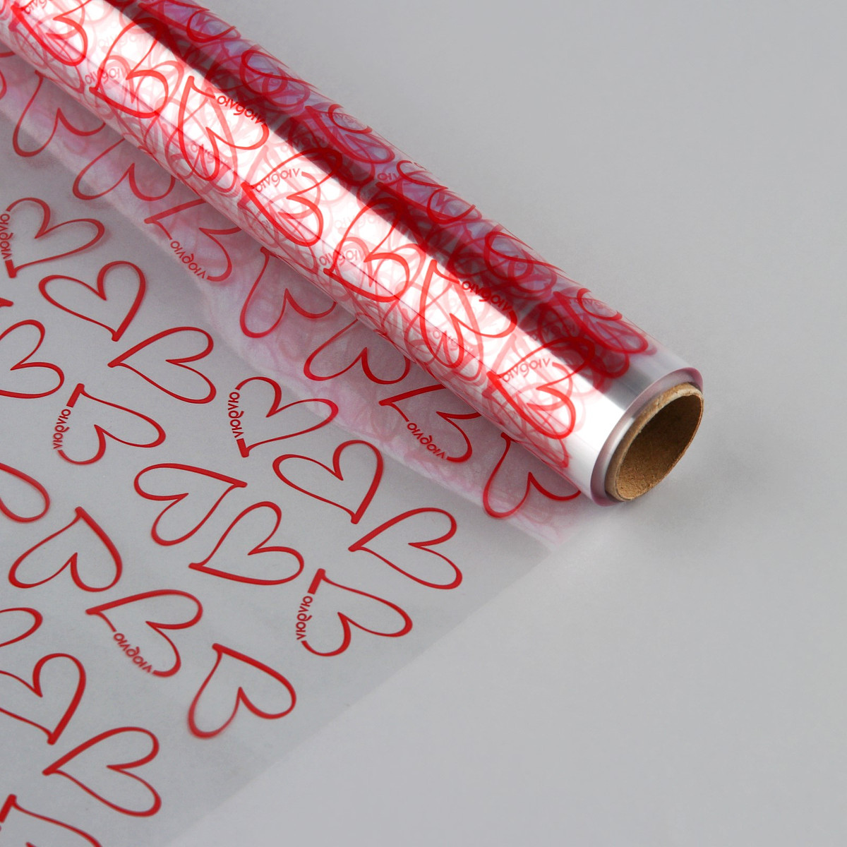 Пленка для цветов упаковочная глянцевая прозрачная «Сердца», красные, 0.6×10 м.