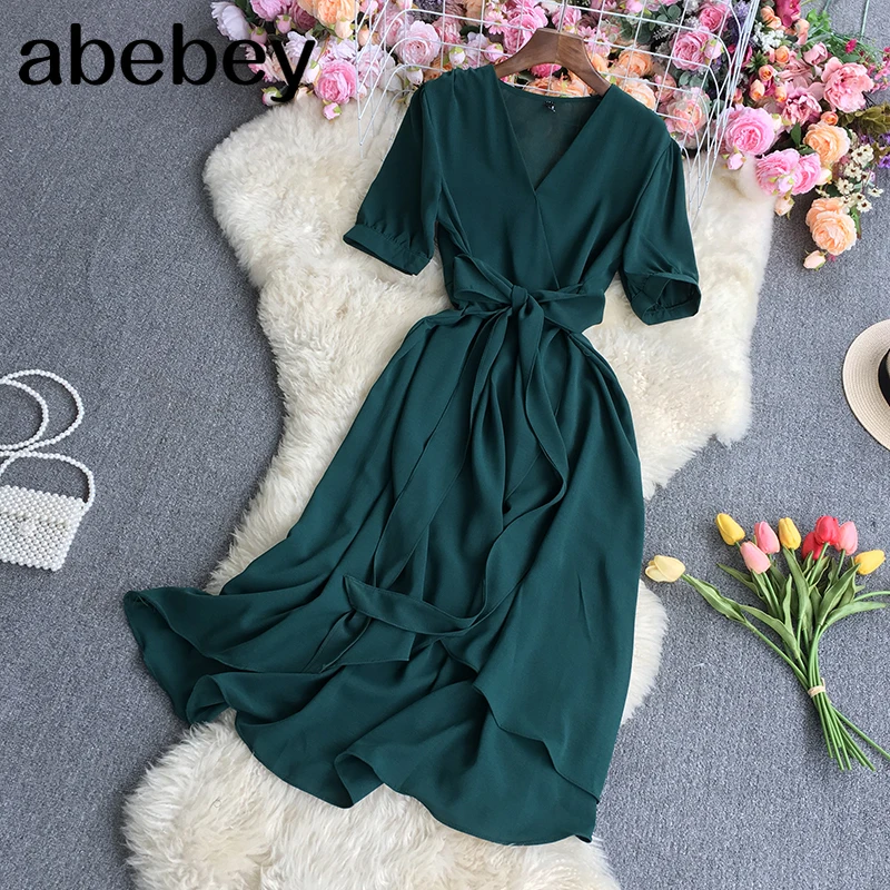 2022 New Spring Autumn French V-neck short sleeve Dress high waist lace up irregular waist solid color mid-length A-line Dress