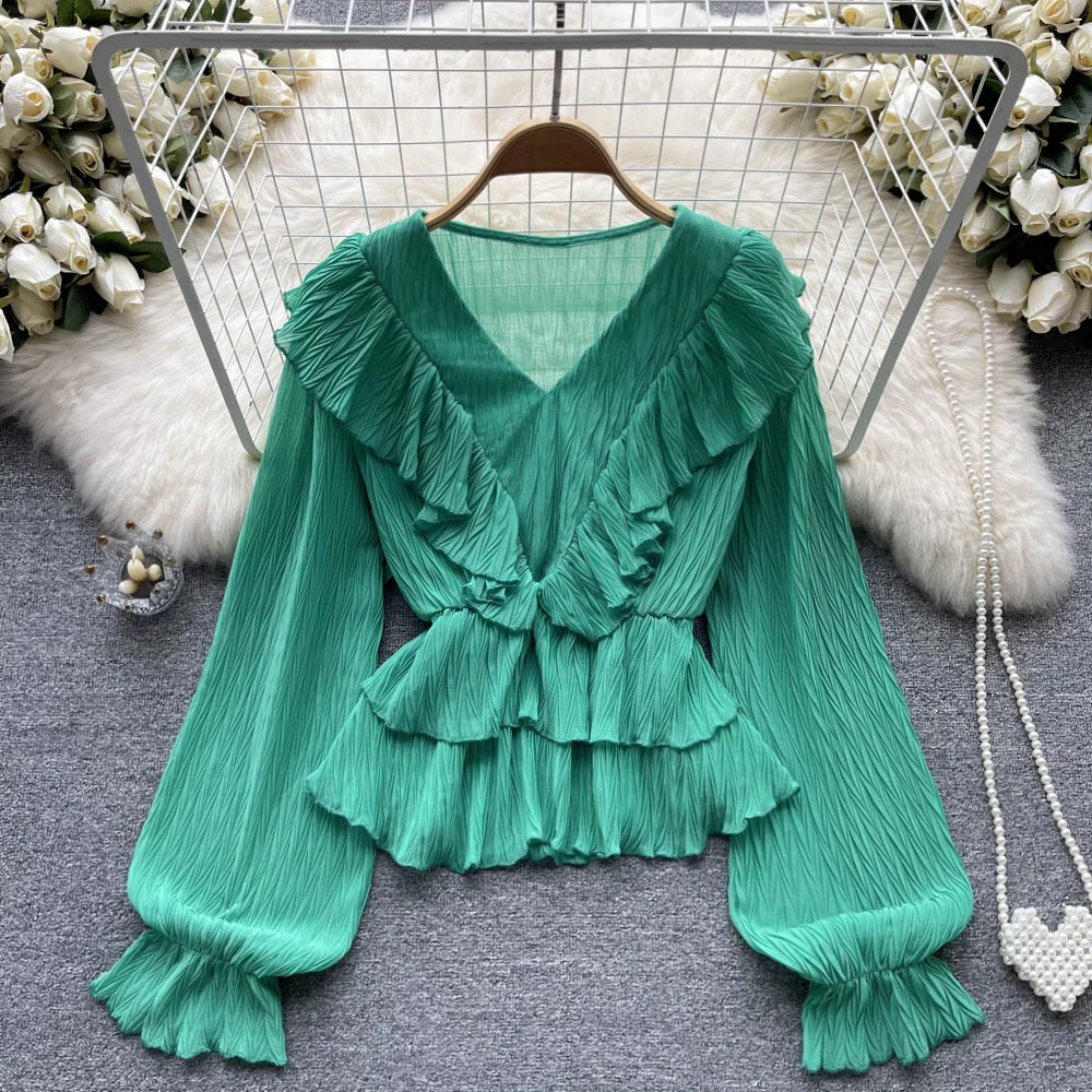 Плиссированная рубашка с v-образным вырезом и рукавами-колокольчиками, осенняя женская короткая белая рубашка