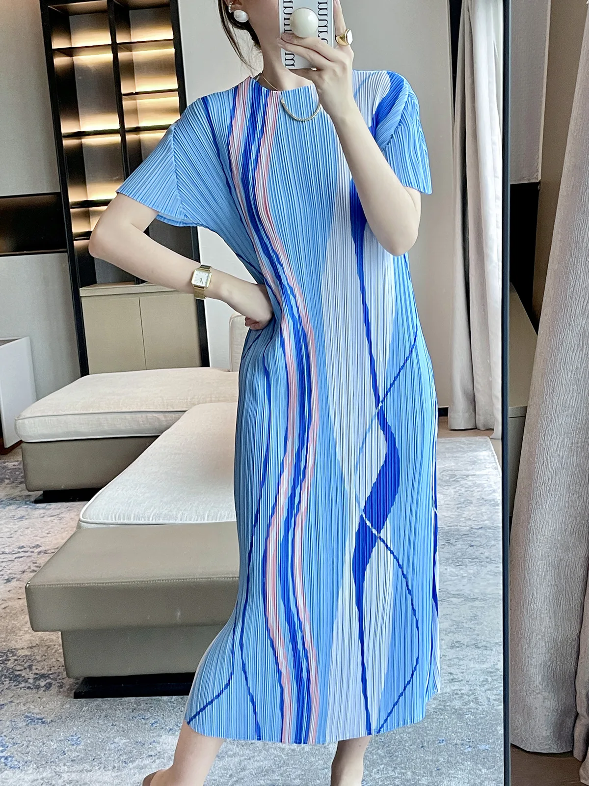 Плиссированное летнее новое облегающее платье в полоску с коротким рукавом 2023 элегантное облегающее платье средней длины