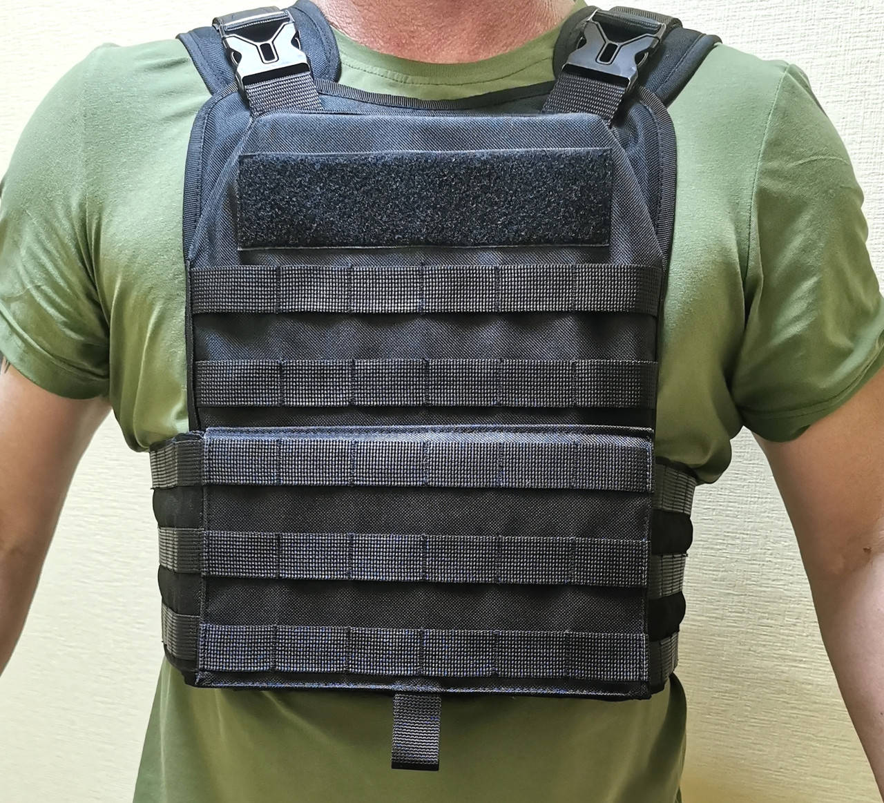 Ткань кордура 1000d цвет чёрный, система молле, усиленные фастексы, для вентиляции сетка 3d ( типа сэндвич), эвакуационная петля, планки из липучки под шевроны сзади и спереди, карманы под плиты с двойной фиксацией брони. Регулировка на плечах ( рост) и на пояснице (объем).