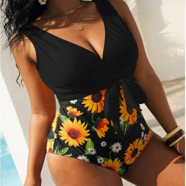 Плюс Размер Бикини Сексуальные Цельные Купальники Женские Плечо Цветочные Женщины Купальники Пуш-Ап Купальники Боди Пляжная Одежда Ruffl 2XL чёрный