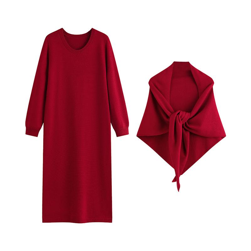 Плюс Размер Женский Круглый вырез с юбкой-основой Трикотажный Длинный Юбка Платье Шаль Комплект XXXL красный