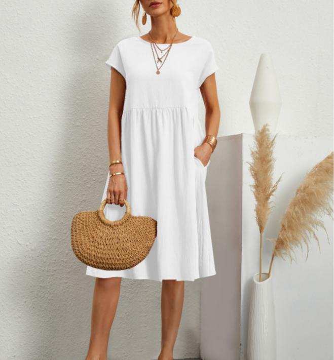 Плюс Размер Хлопок Льняное Платье Для Женщин Летние Повседневные Платья С Карманами Женские Свободные Платья Миди С Коротким Рукавом S белый