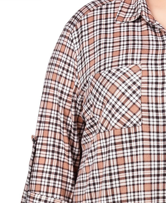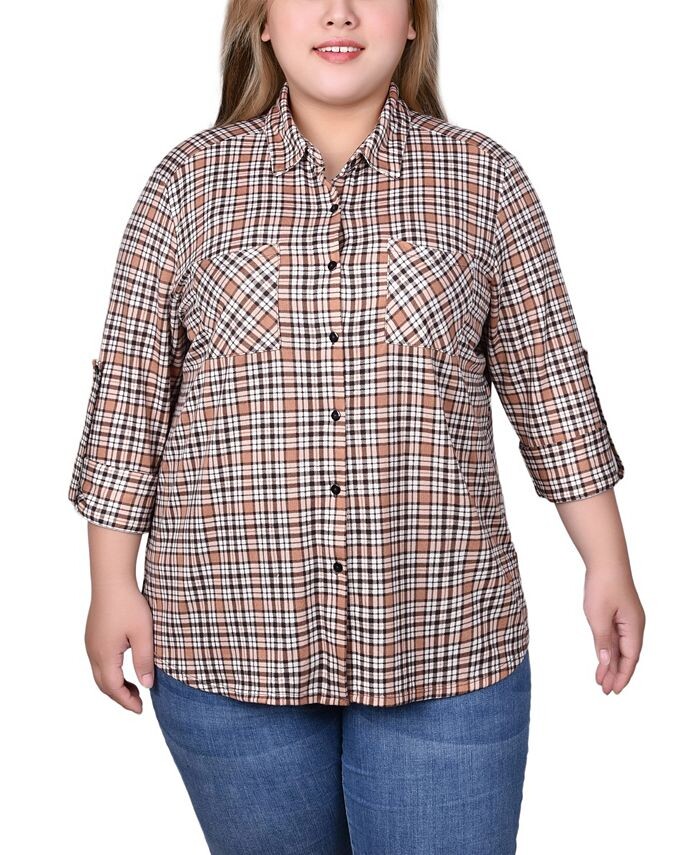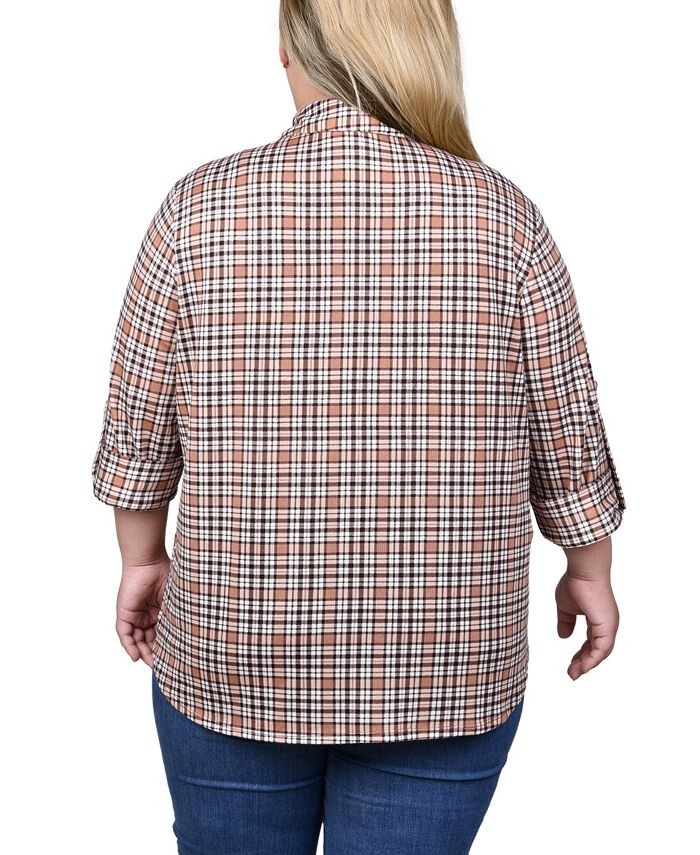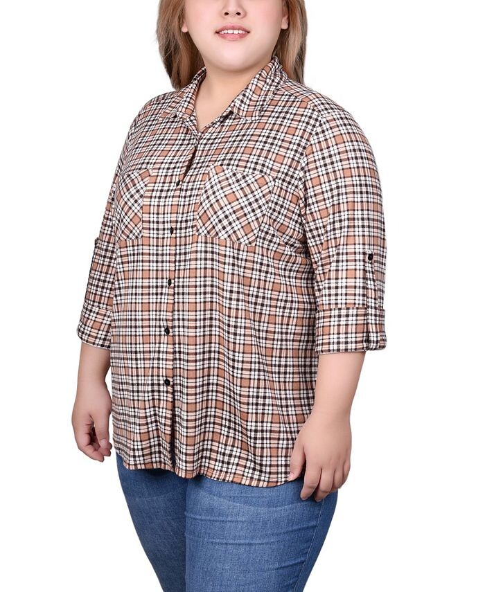Плюс размер Туника с длинными рукавами и пуговицами спереди Топ NY Collection, цвет Tan Plaid