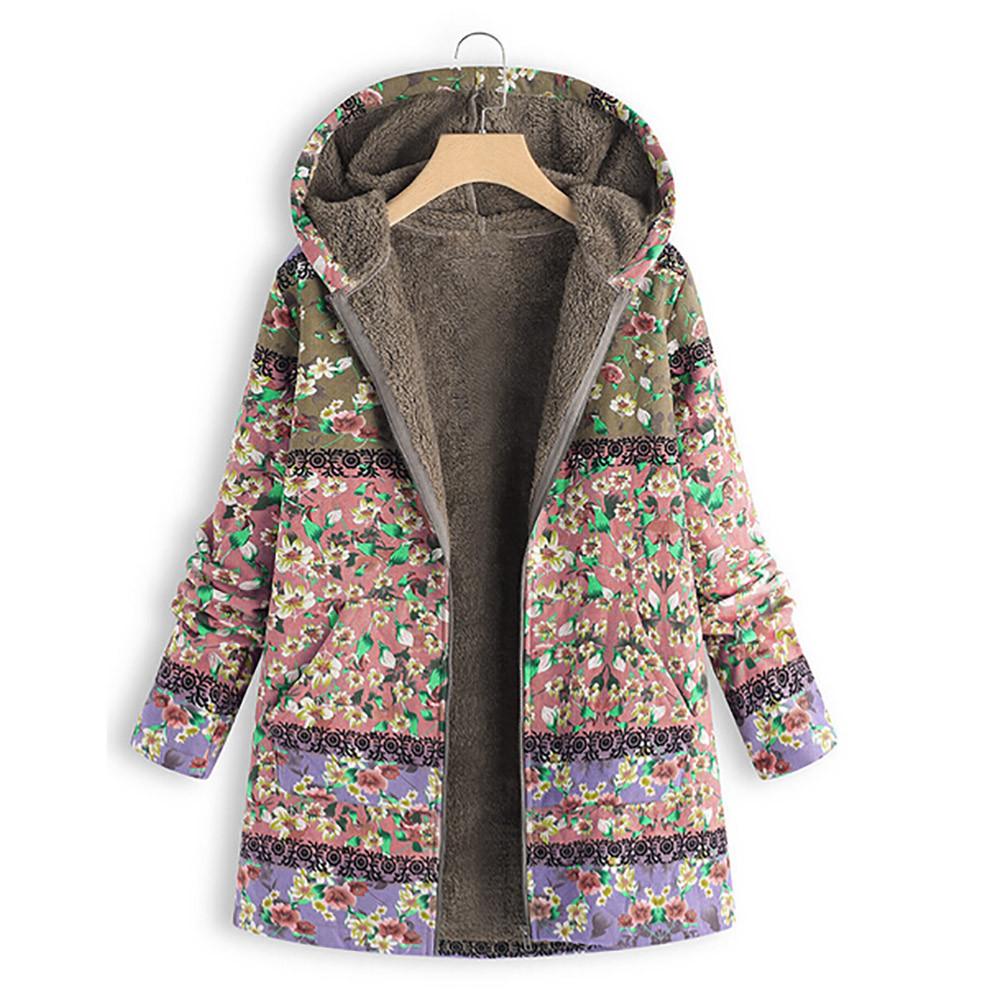 Плюс размер женщин с капюшоном с длинным рукавом Винтаж дамы флисовые толстые пальто пальто на молнии M розовый