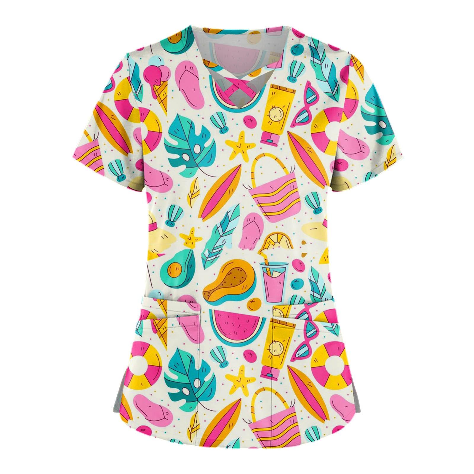 Плюс размер, милая рабочая форма с принтом, топы для женщин, забавные футболки с перекрестным v-образным вырезом и короткими рукавами, рабочая одежда, футболка с двойными карманами XL жёлтый
