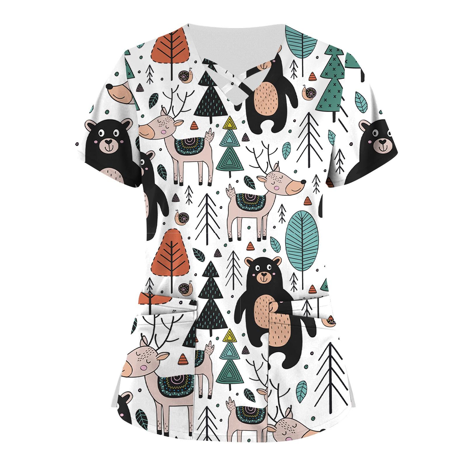 Плюс размер, милая рабочая форма с принтом, топы для женщин, забавные футболки с перекрестным v-образным вырезом и короткими рукавами, рабочая одежда, футболка с карманами L белый