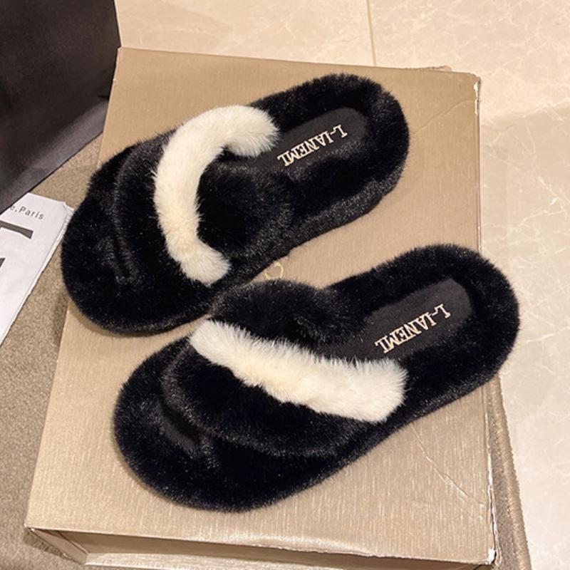 Плюшевые тапочки на толстой подошве в стиле колор-блок для осени и зимы, плоские и модные плюшевые тапочки-крестики 41 чёрный
