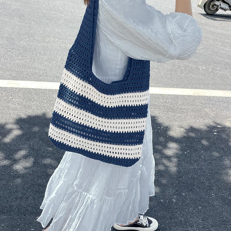 Пляжная вязаная сумка ручной работы для женщин, легкая вязаная сумка-тоут, летняя сумка для покупок, дорожная сумка через плечо 36x2x35cm белый/синий
