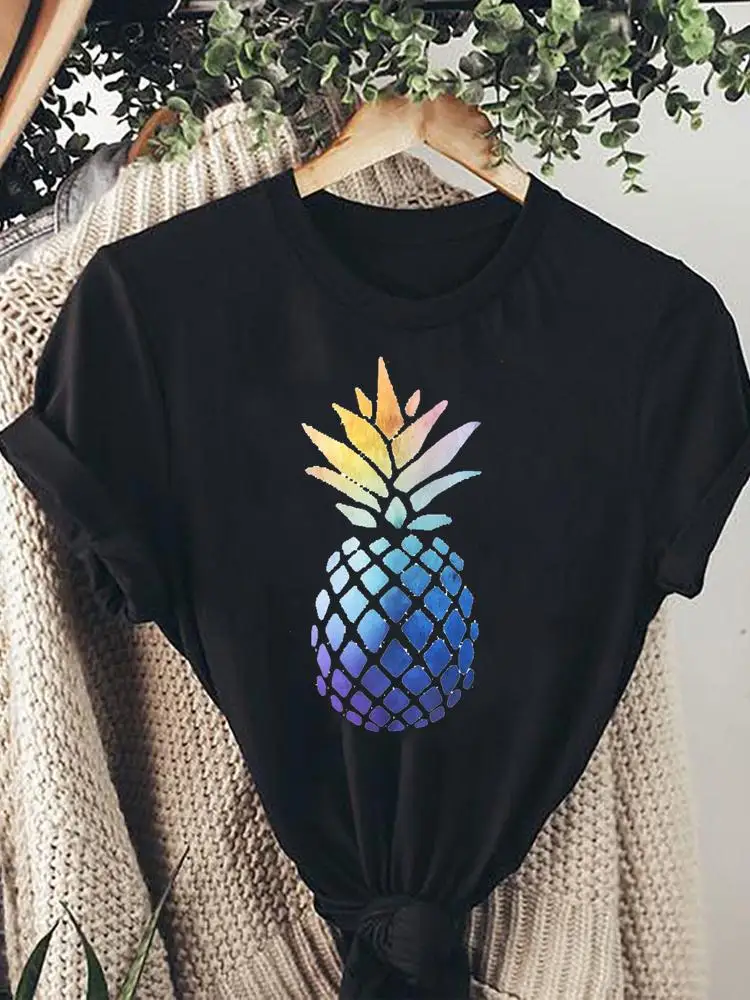 Пляжная одежда в клетку с ананасами, футболки, модная женская летняя одежда с принтом, женская черная футболка с коротким рукавом, футболка ...