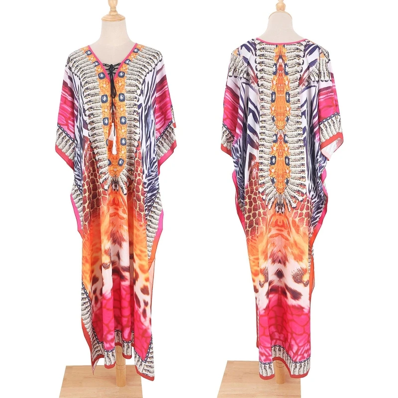 Пляжное платье макси этнический принт змеиная кожа кафтан кисточка шнуровка накидка