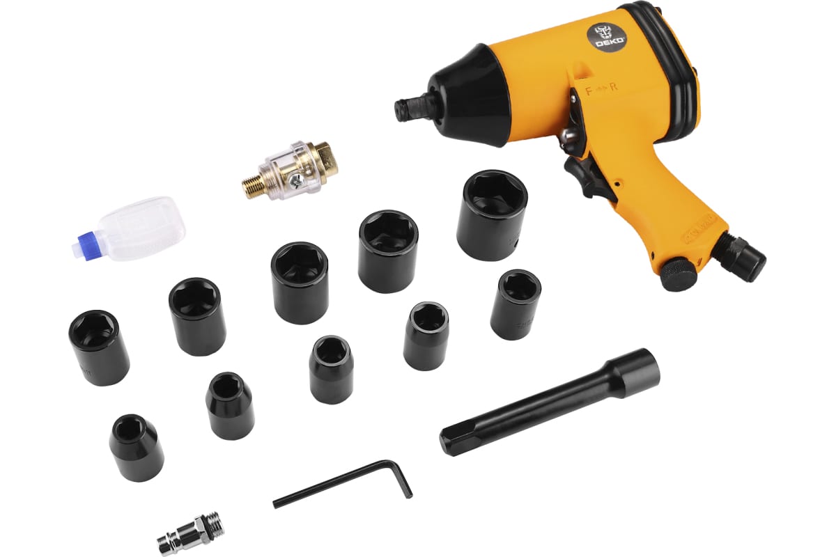 Пневмогайковерт ударный Deko DKPT01 SET 3, 1/2", 5.92 атм, 312 нм, 142л/мин, 7000 об/мин, кейс + набор головок (018-1101), DKPT01 SET 3