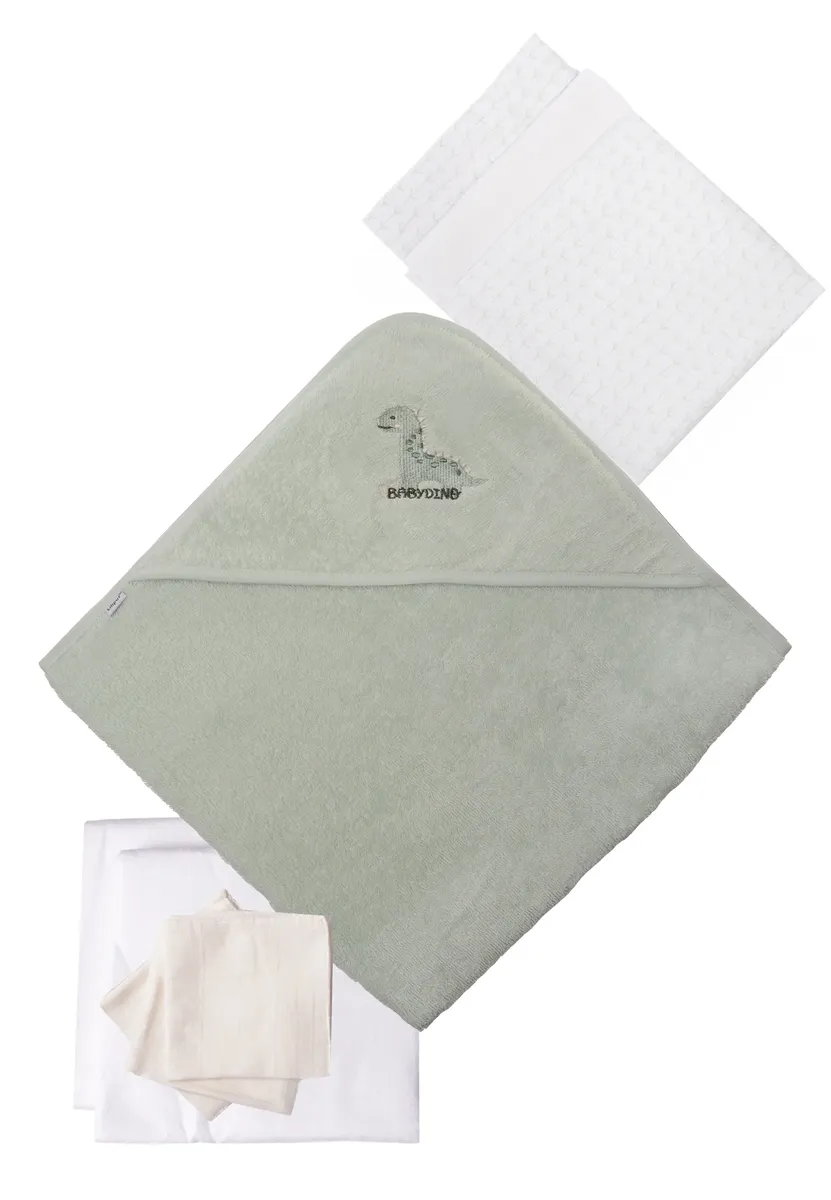 Комплект первоначального снаряжения Liliput "Динозавры", 9 предметов, с впитывающей махровой тканью и банным полотенцем с капюшоном, белый