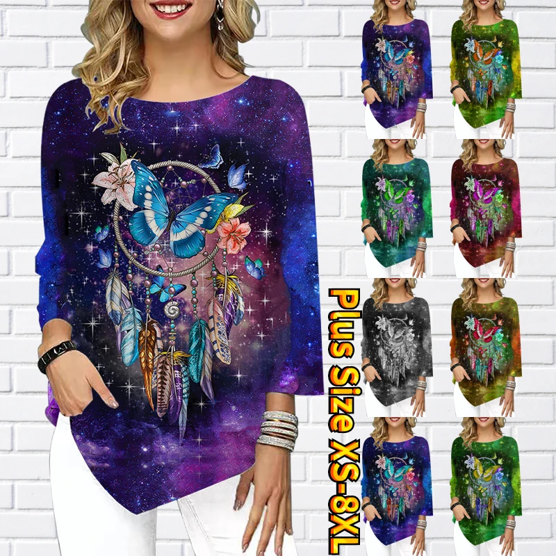 Повседневная Свободная Женская футболка с круглым вырезом, модный Повседневный пуловер с рукавом три четверти, топы с цветочным принтом, Ве...