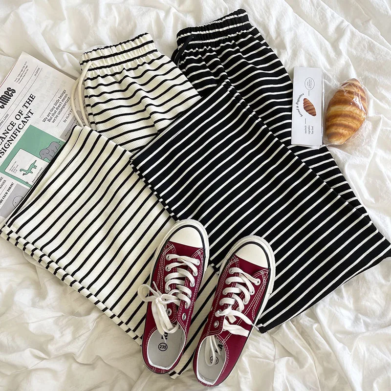 Повседневная Удобная одежда классические полосатые эластичные широкие брюки с высокой талией