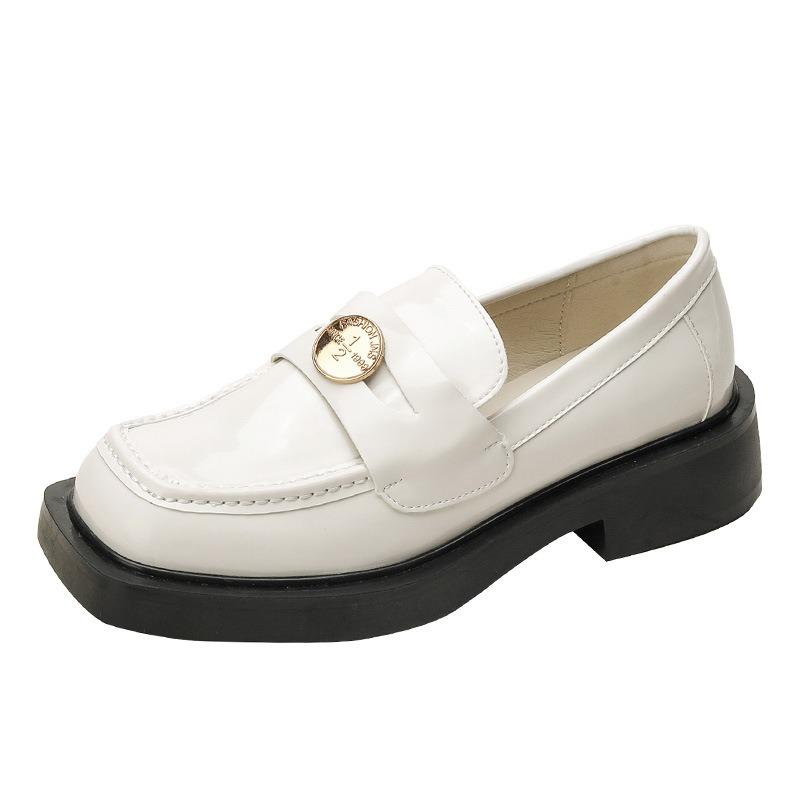 Повседневная модная одинарная обувь весна и лето новая толстый каблук плоская подошва черная толстая подошва квадратный носок мягкая кожа маленькие кожаные туфли 35 белый